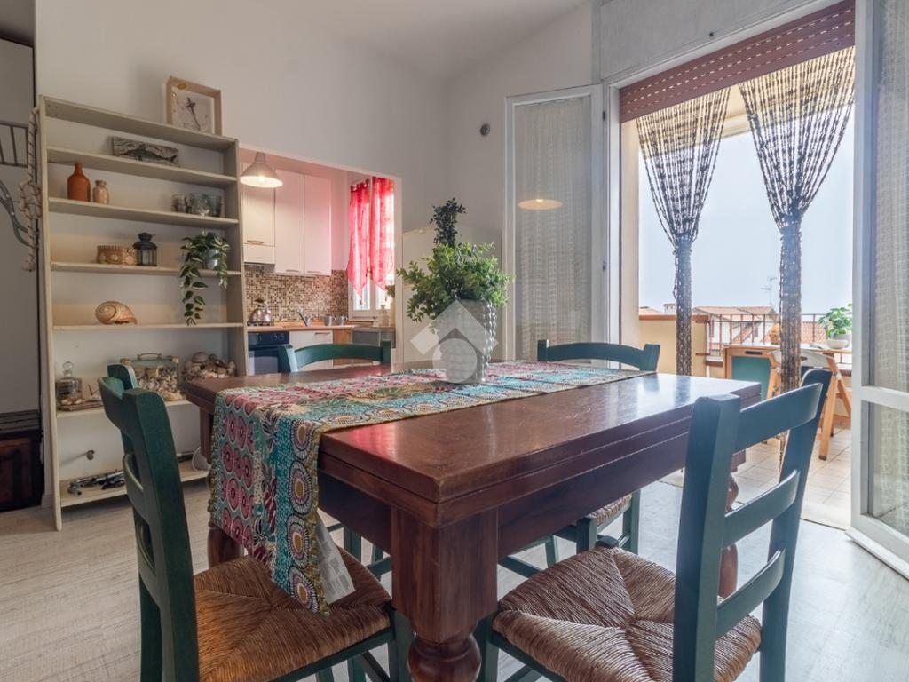 L'immobile, al terzo piano servito da ascensore, offre spazi funzionali e ben distribuiti. La zona giorno si apre su un ampio balcone di 25 mq, ideale per godere di una vista mare rilassante.