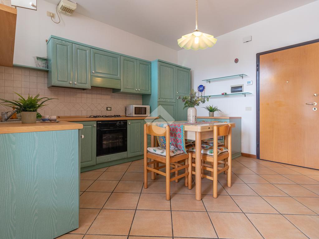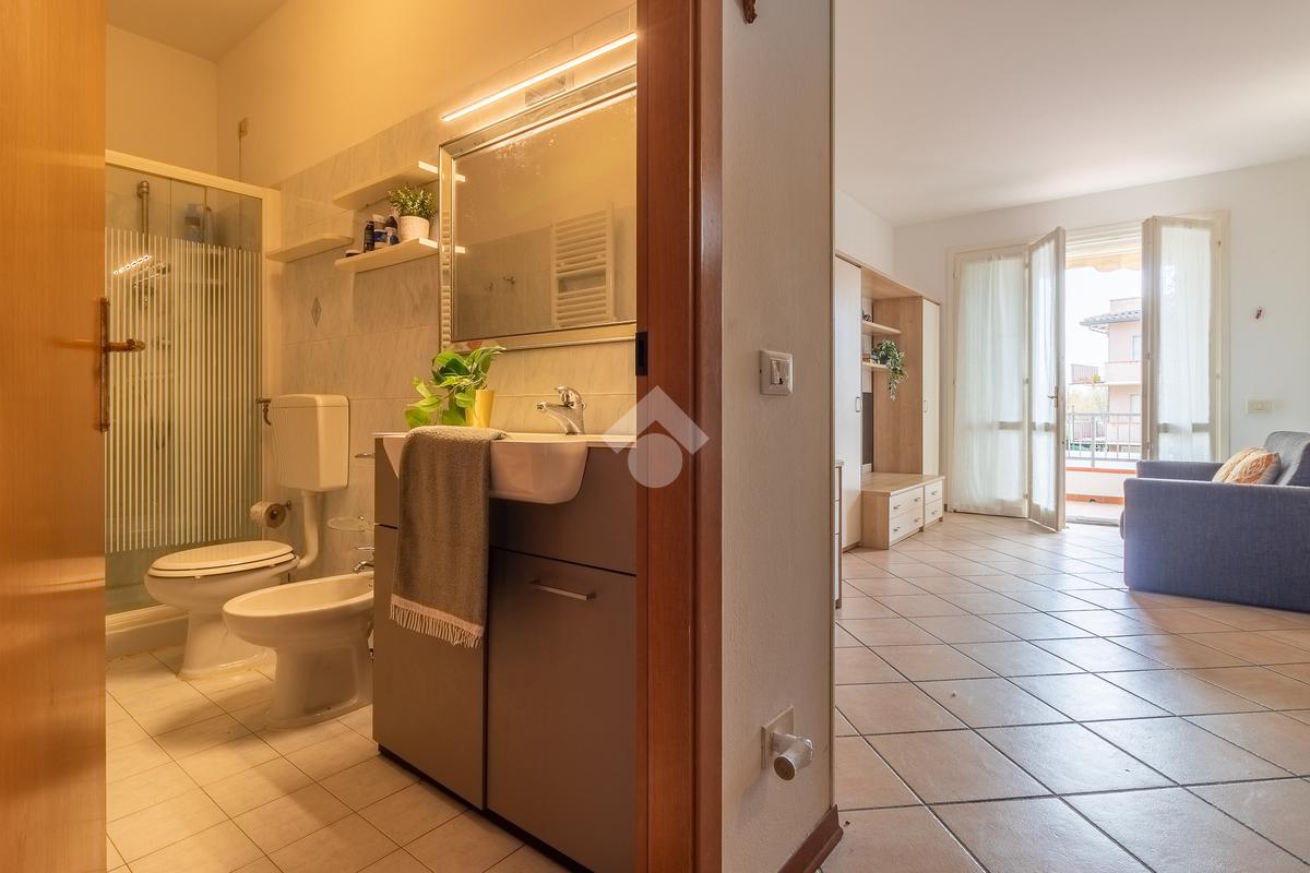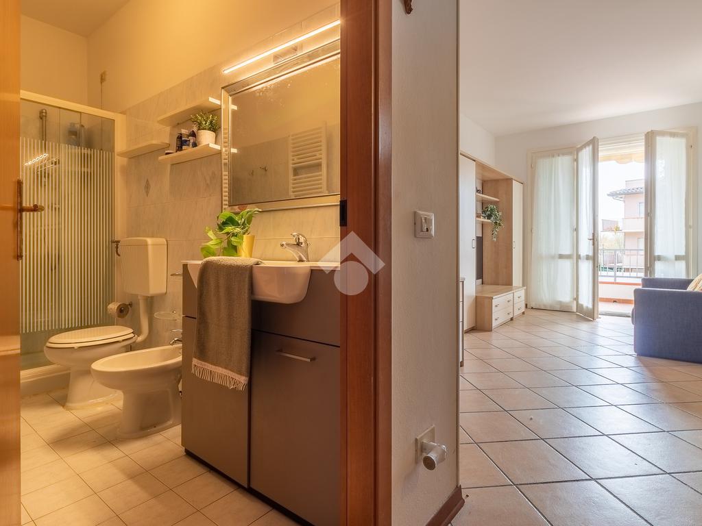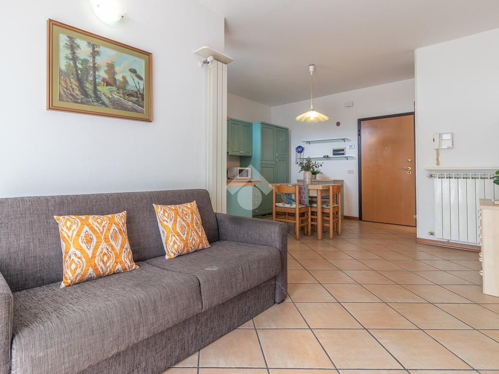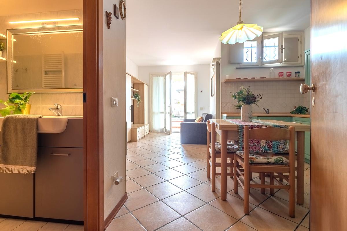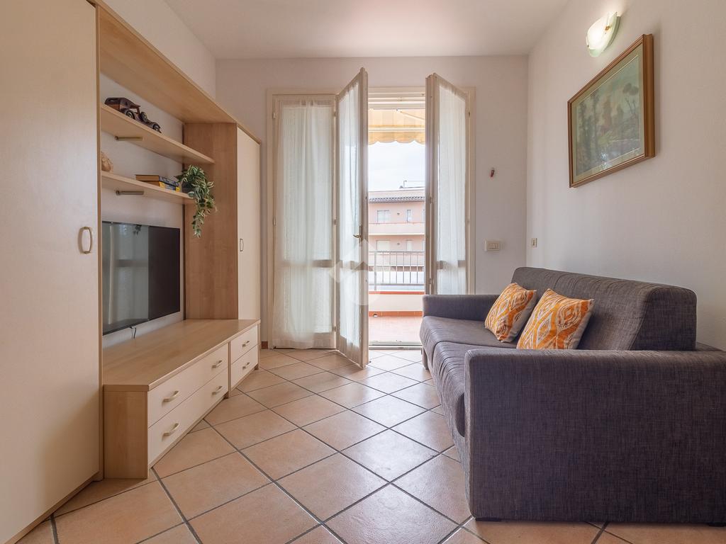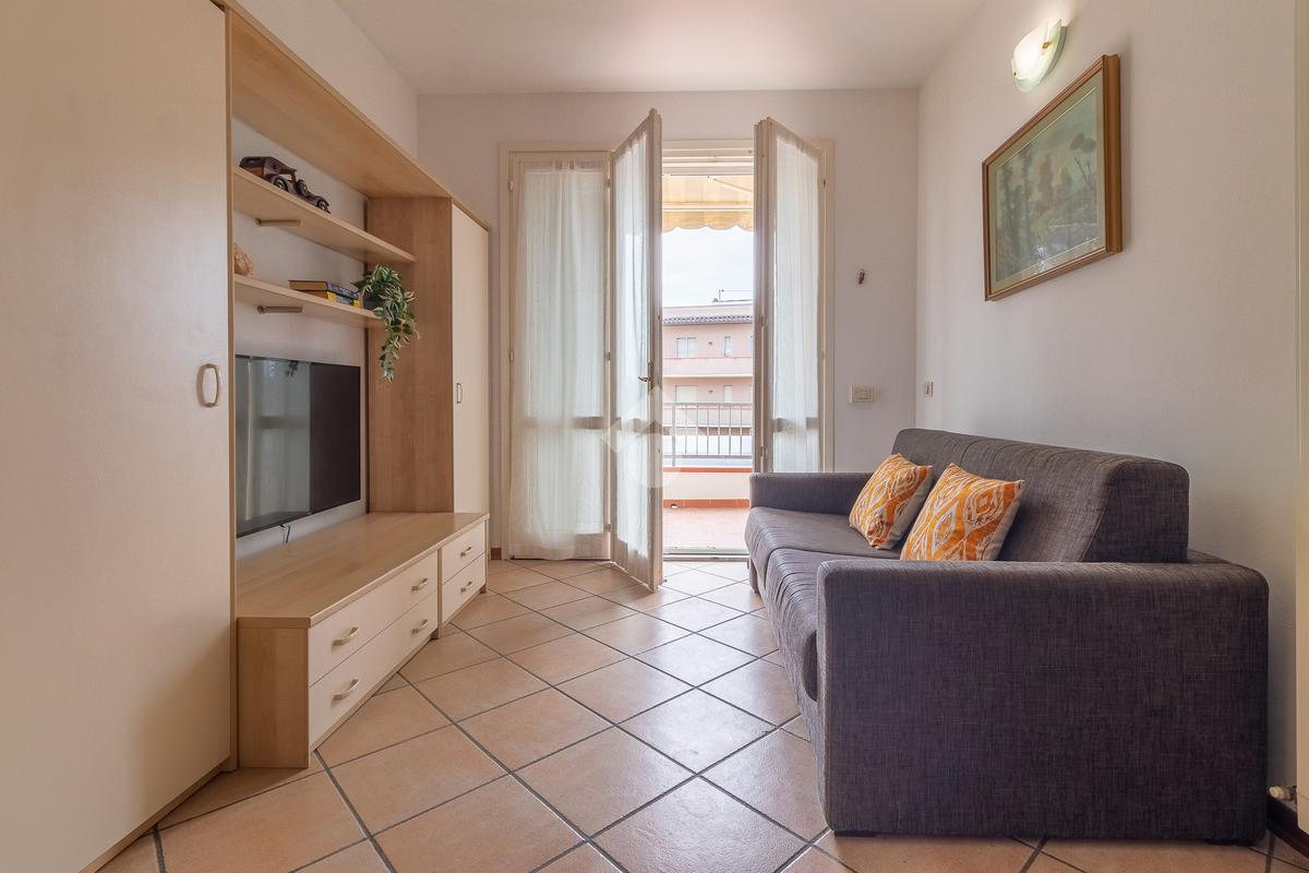 soggiorno ampio e luminoso, con affaccio sul terrazzo, camera da letto divisa e bagno con box doccia.